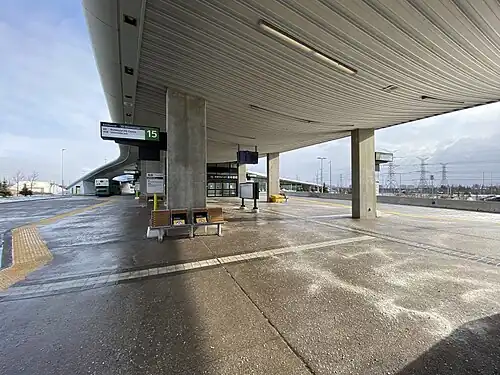 The design team for the station was AECOM as the prime consultant, Aedas as design architect, and Parsons Brinckerhoff as design engineers.[3] The station is an intermodal transit facility providing connections to York Region Transit (YRT), GO Transit buses, and Ontario Northland intercity coaches. It will also connect to a future Highway 407 Transitway.[4] The station has a 550-space commuter parking lot[5] and a large 18-bay regional bus terminal. This station has been engineered and positioned for the construction of underground bus platforms for the proposed Highway 407 Transitway.[6] The station has an open design, particularly to the east overlooking the Black Creek. Due to structural elements related to the water table, the centre platform has no columns, with all weight being transferred to the sides to counter buoyancy.[6] The station has a metal cool roof to reflect heat from the sun.[7]