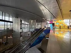Toronto artist David Pearl designed the artwork titled Sky Ellipse consisting of multi-coloured glass panels for the subway skylights and the western bus terminal glass facade. The panels show moving projections of colour. Sunlight filters down to platform level.[8][4][3]