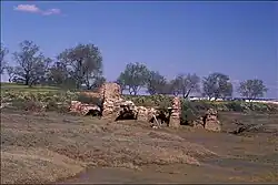 The mill stands on a small elevation of the land and is rectangular in shape. The remains of the base and some ruined walls can be seen, oriented on a northwest-southeast axis. Under it, there are at least four cavities, finished off in brick and separated by the starlings. The main hypothesis is that the mill used the technology of a channel wheel and it is known from the remains found that the milling capacity was that of four millstones.[3]