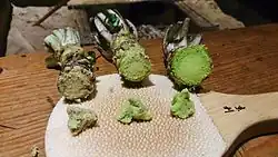 Processed products of water-grown wasabi include additive‐free wasabi paste, Japanese yam paste mixed with wasabi,[7] sausages containing wasabi, and other things.[30] Soil-grown wasabi is used mainly to make wasabi paste.[31][32] Soil-grown wasabi's leaves, stems, and flower parts are also used as ingredients of pickled products such as shōyu-zuke (soy sauce pickles), sakekasu-zuke (pickles in sake lees), miso-zuke (miso pickles),[33] and sweets such as ice cream[34] and pudding.[35][36] Wasabi shoots (known locally as ganime) with good texture are used especially for shōyu-zuke.