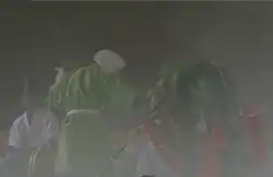 Iwami Kagura is a traditional performance art of western Shimane Prefecture. In modern times, a Kagura play has been created by locals to pray for a good wasabi harvest.[37] Nishida Tamotsu created the wooden masks. Watanabe Tomochiyo, who is a researcher of Iwami Kagura and ethnology, created the words, and the Mikazura Kagura Preservation Society, all members of which are wasabi farmers, created the choreography.[37] The title "Yamaaoi Tengu" was named after the official name of the Wasabi Shrine. The performance was first performed at the Shrine on June 5, 1983.[37] The Wasabi Kagura has continued to be performed since then. The story goes that a tengu, an object of worship of the shrine, slays disease and insects (in anthropomorphized forms) to save suffering wasabi farmers.