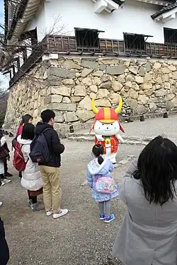 Hikonyan (ひこにゃん) is a mascot created by the city government of Hikone, Japan. He was created in 2007 to mark the 400th anniversary of the founding of Hikone Castle. The character design is derived from a legend concerning maneki-neko and Ii Naotaka, the 3rd Lord of Hikone.[1][2][3] The daimyō was beckoned by a white cat to seek shelter from a storm in a temple, and thus saved from a lightning strike.[4] In Japanese, "nyan" is an onomatopoeia for a cat's meow. Hikonyan's samurai helmet is based on a Ii family helmet currently in the Hikone Castle museum. Hikonyan's popularity increased tourist visitation of Hikone by over 200,000 annually. The estimate of Hikonyan's effect on the tourist industry is 17.4 billion yen (approximately US$218 million) and the overall economic effects total 33.8 billion yen (US$425 million). Total merchandise sales reached about 1.7 billion yen (US$21 million) as of 2008.[5] In 2010, Hikonyan won first place in the Yuru-chara Grand Prix competition against 168 other mascots, collectively known as yuru-chara (ゆるキャラ).[6]