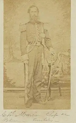 When the war broke out, Marcó already held the rank of lieutenant colonel and participated in several battles, notably within the Battle of Tuyutí on 24 May 1866, where he commanded a column of 4300 men that would force an attack on the center of the allied camp.[2][3] During the battle, Marcó lost his left hand. For his performance in the battle, he received the distinction of the National Order of Merit. He would later command the firing squad against alleged conspirators of Solano López during the 1868 San Fernando massacre.[4] Marcó would be sentenced to death after being accused of conspiring with Venancio López to overthrow Solano López along with 16 other officers.[5][6] He was shot in October 1869 after weeks of torture.[2]