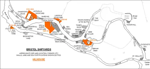 Bristol Shipyards with the various locations of Hilhouse highlighted. They operated five different sites in the 18th and 19th centuries.