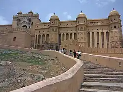 Amber Fort is a fort located in Amer. Located high on a hill, it is the principal tourist attraction in Jaipur.[20] Amer Fort is known for its artistic style elements. With its large ramparts and series of gates and cobbled paths, the fort overlooks Maota Lake,[21] which is the main source of water for the Amer Palace. Amber was a Meena state, Which was ruled by his Susawat clan. After defeating whom Kakil Deo, son of Dulherai, made Amber the capital of Dhundhar after Khoh.[22][23] The Amber Fort were originally built by Raja Man Singh. Jai Singh I expanded it. Improvements and additions were done successive rulers over the next 150 years, until the Kachwahas shifted their capital to Jaipur during the time of Sawai Jai Singh II, in 1727.[24][25]