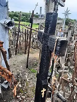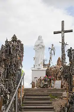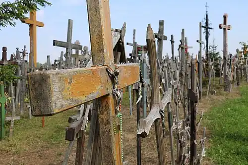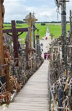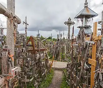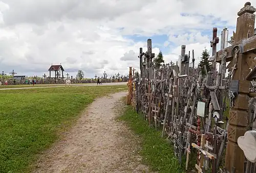 Hill of Crosses (Lithuanian: Kryžių kalnas) is a site of pilgrimage about 12 km north of the city of Šiauliai, in northern Lithuania. The precise origin of the practice of leaving crosses on the hill is uncertain, but it is believed that the first crosses were placed on the former Jurgaičiai or Domantai hill fort after the 1831 Uprising.[2] Over the generations, not only crosses and crucifixes, but statues of the Virgin Mary, carvings of Lithuanian patriots and thousands of tiny effigies and rosaries have been brought here by Catholic pilgrims. The exact number of crosses is unknown, but estimates put it at about 55,000 in 1990[3] and 100,000 in 2006.[4] It is a major site of Catholic pilgrimage in Lithuania.