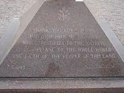 A stone inscribed with the words of Pope John Paul II: "Thank you, Lithuanians, for this Hill of Crosses which testifies to the nations of Europe and to the whole world the faith of the people of this land."
