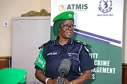 Her role for ATMIS started on 2 March 2023 with the aim to maintain security and stability in Somalia, train the local police force and provide equipment.[7][8] In July, she awarded several medals to Nigerian police officers who completed their tour.[9] She praised Sierra Leonean police officers who took part in the peace effort in Somalia during their ATMIS mission.[10][11] She oversaw various trainings for the Somali Police Force.[12] She also focuses her effort on terrorist threats such as al-Shabab.[13][14]