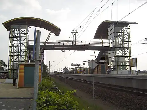 The first railway station in the town was opened in 1891, closed in 1898 and torn down in 1900. A second railway station was opened on a different location in 1898, when the first was closed. It was designed by the architect D.A.N. Margadant. The freight tracks on the railway station were used to transport flowers from the nearby fields to i.a. the flower auction in Aalsmeer. During World War II, these tracks were used by the Germans, making it a prominent target for allied bombings. The passenger railway station was closed as a result of this on 17 September 1944. The freight tracks remained in use until the 1980s.
