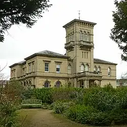 It was built in 1867–69 by Albert Estcourt to a design by John Giles for the timber merchant Charles Walker, and replaced an earlier house of 1826 known as Woodbine Hill.[2] One source states that the previous building was a "classical villa which dates back to around 1820".[3][4] It once had extensive grounds, but these are now a park known as Hillfield Gardens.[5] The description in December 2020 stated: "Now a Council-owned public park covering about 1.6 hectares, Highfield Gardens is supported by an active Friends group which organises annual events".[6]