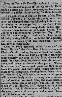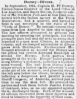 In early 1849, Dorsey may have been one of the American mercenary soldiers involved in the Yucatán Caste War.[8][9] Dorsey came to California in 1849 as part of a train of gold-rush migrants traveling via the Arkansas River–Canadian River–Gila River route from Fort Smith, Arkansas, through Santa Fe, New Mexico, a route later known as the California Road.[10] Dorsey's group celebrated Independence Day 1849 in Socorro, New Mexico; "Marshaled by Captain H. P. Dorsey, the men fired a salute of four rounds. Then came a feast of lamb, spiced by bottles of treasured Holland gin, cognac, and champagne, preceded by a fandango well-attended by Mexican señoritas."[11] Once settled in California, Dorsey joined a Masonic lodge,[12] and he worked for the U.S. General Land Office. Dorsey was said to be a pioneer of walnut cultivation in Southern California.[13] In California he was involved in vigilante killings and body desecration in the wake of the murder of a local sheriff,[14] and developed a fearsome reputation as a Bowie-knife-wielding brawler, in one case popping a man's eye out.[15] According to a history of the old Bella Union Hotel in what is now the downtown core of Los Angeles, "At that period dueling was still practiced to some extent. It happened that a fight in the Bella Union barroom led to a duel later at Clinton, near San Francisco. A man named Bevin, from Tejon, cowardly attacked the Registrar of the Land Office, H. P. Dorsey; and each accused the other of being a rascal. A gun in the hands of Dorsey went off. The men were finally separated by the crowd. When they met up north, they exchanged shots [and] were arrested, but their cases were dismissed."[16] As historian Hubert Howe Bancroft told it, Dorsey was caught up in "mania for duels" in California in the year 1854: "The 22d of September Rasey Biven of Stockton, and H. P. Dorsey of Los Angeles, met near Oakland. The seconds of Dorsey were Governor McDougal and Mr. Watson. Surgeon, C. M. Hitchcock. Seconds of Biven, Senator Crabb and Mr. Randolph. Surgeon, Briarly. Weapons, duelling pistols. Distance, ten paces. Word was given by Biven's friends. At the first fire Dorsey was wounded in the abdomen, and Biven in the wrist."[17]