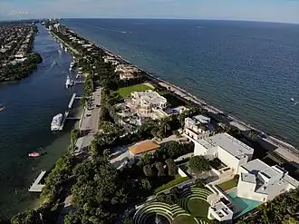 The 3.2-mile (5.1 km) strip along Florida State Road A1A is officially known as "Hillsboro Mile" in the town's boundaries, and it's the only main road in town. Because this is the only main public road, it is aligned with the residents' mansions and commonly called "Millionaires' Mile" by both local residents and visitors alike.[1] Its own official motto also notes this by referring to it as "Florida's Magnificent Mile".[2]