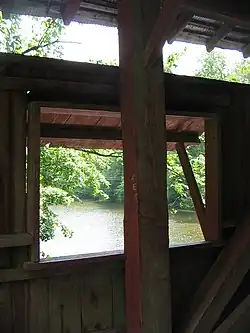 The covered bridge rests on abutments of stone and mortar, which have been reinforced with concrete. There are no parapets.[4] The bridge beams are reinforced in places with steel beams.[20] The bridge deck is made of crosswise "narrow width laid flooring".[21] Wheel guards on the deck separate the roadway from the pedestrian walkways on either side and protect the sides, which are covered with "vertical board and batten siding" almost to the eaves.[4] The interior and exterior are painted red. The bridge has long, narrow windows with wooden shutters: the south side has three windows, and the north side has two. An opening between the eaves and the siding runs the length of the bridge on both sides. The gable roof is wooden shake shingles. The bridge is supported by a Burr arch truss, and is similar in design and construction to the one in Forksville.[4] The western end of the Hillsgrove bridge lies against a steep hillside,[21] and those approaching the bridge from the west must make a sharp right turn to enter it.[17] Prior to the 2010 restoration, the sides were unpainted, but the portals were painted red, while the gable roof was sheet metal which had been installed over the original wooden shake shingles.[4]