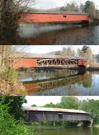![]() Hillsgrove Covered Bridge over Loyalsock Creek after restoration in 2012 (top), with flood damage in 2011 (middle), and before restoration in 2008 (bottom) | |