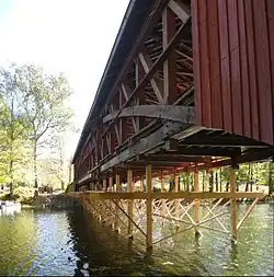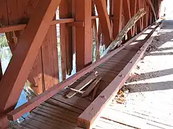 - ^ Note: Follow these links for photographs of steel reinforcements on kingposts and the Burr arch and steel I-beams on the underside of the bridge.