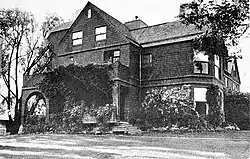 Nell Lloyd Jones asked her nephew to design this structure because she and Jenny were planning on beginning the Hillside Home School on land left to them by their father.[3] This building, which became known as the "Home Building",[4][5] was the first one designed specifically by Wright for the school, a coeducational day and boarding school which functioned until 1915.[6] Silsbee had introduced the young Wright to the "Shingle Style mixture of Queen Anne and Colonial elements."[7] In 1907, Spring Green's newspaper, the Weekly Home News, ran an article focused on the Hillside Home School institution, then in its twentieth year. In the section about the Home Building, the article stated that it: