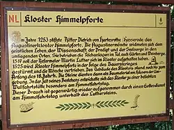 The monastery was founded in 1253 by the lords of Hartesrode in a sheltered, wooded valley, northwest of Hasserode. They chose this site because Hermits of St. William had previously resided here. The Augustinian friars bred fish and even grew vineyards. Martin Luther visited Himmelpforten on 6 August 1517, where he met his friend and fellow friar, at that time the Vicar General of the Order, Johann von Staupitz, with whom he discussed the sale of indulgences.
