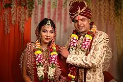 The pre-wedding and post-wedding rituals and celebrations vary by region, preference and the resources of the groom, bride and their families. They can range from one day to multi-day events. Pre-wedding rituals include engagement, which involves vagdana (betrothal) and Lagna-patra (written declaration),[12] and Varyatra— the arrival of the groom's party at the bride's residence, often as a formal procession with dancing and music. The post-wedding ceremonies may include Abhisheka, Anna Prashashana, Aashirvadah, and Grihapravesa – the welcoming of the bride to her new home. The wedding marks the start of the Grhastha (householder) stage of life for the new couple. In India, by law and tradition, no Hindu marriage is binding or complete unless the ritual of seven steps and vows in presence of fire (Saptapadi) is completed by the bride and the groom together.[13] This requirement is under debate, given that several Hindu communities (such as the Nairs of Kerala or Bunts of Tulu Nadu) do not observe these rites.[14] Approximately 90% of marriages in India are still arranged.[15] Despite the rising popularity of love marriages, especially among younger generations, arranged marriages continue to be the predominant method for finding a marriage partner in India.[15]