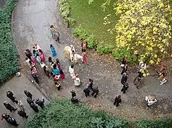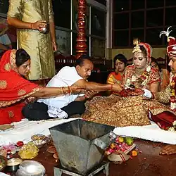 The Saptapadi (Sanskrit "seven steps"/"seven feet"; sometimes called Saat Phere: "seven rounds"[24]) is the most important ritual of Vedic Hindu weddings, and represents the legal element of the Hindu marriage ceremony.[25] The couple conduct seven circuits of the Holy Fire (Agni), which is considered a witness to the vows they make to each other.[26] In some regions, a piece of clothing or sashes worn by the bride and groom are tied together for this ritual. Elsewhere, the groom holds the bride's right hand in his own right hand.[26] Each circuit of the consecrated fire is led by either the bride or the groom, varying by community and region. Usually, the bride leads the groom in the first circuit. In North India, the first six circuits are led by the bride, and the final one by the groom.[27] In Central India and Suriname, the bride leads the first three or four circuits.[26] With each circuit, the couple makes a specific vow to establish some aspect of a happy relationship and household for each other.