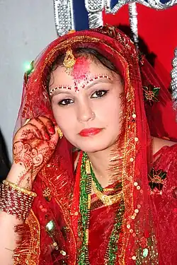 The weddings are very colourful, and celebrations may extend for several days and usually a large number of people attend the wedding functions. The bride's and groom's homes—entrance, doors, walls, floor, roof—are sometimes decorated with colors, flowers, lights and other decorations.[2]