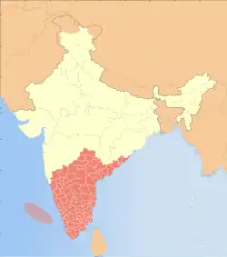 Hinduism in South India refers to the Hindu culture of the people of South India. Hinduism in South India is characterized by Dravidian customs and traditions, hence it is also called Dravidian Hinduism. The Dravidians made great contributions to the development of Hinduism.[1] South India was the birthplace of many Hindu saints and reformers. The Brahmins (Hindu priests class) of ancient Dakshinapatha (Tamilakam, Telangana, Karnataka including Maharashtra and Gujarat) were classified as Pancha-Dravida (The Five Dravidians).[2][3] The Hindus in South India are followers of various Hindu branches such as Vaishnavism, Shaivism, Shaktism, Brahmanism and others. Hinduism was the state religion of most of the South Indian kingdoms. During the Ancient and Middle Ages were built in South India one of the greatest Hindu temples. South Indian kings such as the Cholas spread Hinduism overseas to parts of Southeast Asia.[4] The activities of South India across the Palk Strait led to survival of Hinduism in Sri Lanka[5] among the Sri Lankan Tamils. Some Hindu festivals are celebrated mostly or exclusively in South India and Sri Lanka. In South India are also numerous Hindu pilgrimage site that is visited annually by thousands of devotees.[6]