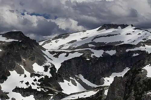 Hinman Glacier was a glacier that flowed to the north and northwest from near the summit of Mount Hinman, in the U.S. state of Washington. Hinman Glacier was within the Alpine Lakes Wilderness of Snoqualmie National Forest.[2] The glacier was approximately 1.3 km2 (320 acres) in 1971, making it the largest glacier between Mount Rainier and Glacier Peak,[3] but an expedition by glaciologists from Nichols College in August 2022 discovered that the glacier had disappeared, with only a few snowfields and non-flowing remnant ice areas totalling 0.04 km2 (9.9 acres) remaining.[4][5] Smaller glaciers in this part of the Cascade Range preceded the Hinman Glacier in disappearing as part of the retreat of glaciers since 1850 with only three glaciers remaining in King County.[6]