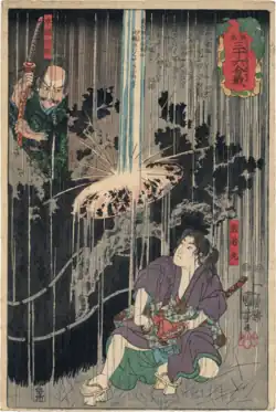 ![]() Kumawaka plotting to assassinate Homma Saburō, as imagined by Utagawa Kuniyoshi. | |