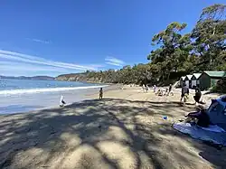 Hinsby Beach is a beach along the River Derwent in the Hobart suburb of Taroona, Australia. The south facing beach looks directly out to Storm Bay and the Tasman Sea, with views of the Derwent estuary, the Alum Cliffs, Taroona Shot Tower, the City of Clarence on the eastern shore and Opossum Bay, South Arm. Hinsby Beach is situated between the Alum Cliffs and Taroona Beach.[2] A naturally secluded section of the beach, beyond the rocky south-western outcrop is a zoned naturist beach.[3]