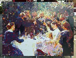The work shows various members of the Skagen Painters: a group of Danish, Norwegian and Swedish artists who formed a loose community in Skagen at the northern tip of Jutland in the 1880s and early 1890s.[2] Hip, Hip, Hurrah! is typical of the work produced by the Skagen Painters; very much in the style of the French Impressionists and Naturalists, it celebrates the play of light in the scene (and in composition and subject draws obvious comparisons to Renoir's Luncheon of the Boating Party),[3] but at the same time it harks back to the freundschaftbild tradition of artists of the Danish Golden Age such as Ditlev Blunck and Wilhelm Bendz in depicting artistic communities spontaneously drawing together.[4] The development of Krøyer's Skagen style can be seen by comparing Hip, Hip, Hurrah! with Ved frokosten (Artists' Luncheon at Skagen), a similarly themed 1883 painting which features many of the same people;[5] and with later works like Sommeraften ved Skagens strand. Kunstneren og hans hustru (Summer Evening at Skagen beach. The Artist and his Wife) and Roser (Roses).