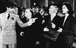 Although Hawks considered the dialogue of The Front Page to be "the finest modern dialogue that had been written", more than half of it was replaced with what Hawks believed to be better lines.[9] Some of the original dialogue was left the same, as were all of the characters' names with two exceptions: Hildy's fiancé (now no longer a fiancée) was given the name Bruce Baldwin,[8] and the name of the comic messenger bringing the pardon from the governor was changed from Pincus to Pettibone.[10] Harry Cohn of Columbia Pictures approved Hawks' idea for the film project. Ben Hecht and Charles MacArthur, the writers of the original play, were unavailable for screenwriting. Consequently, Hawks considered Gene Fowler as the screenwriter, but he declined the job because he disliked the changes to the screenplay Hawks intended to make.[8] Hawks instead recruited Charles Lederer, who had worked on the adaptation for The Front Page, to work on the screenplay.[11] Though he was not credited, Hecht assisted Lederer in the adaptation.[12] Additions were made at the beginning of the screenplay by Lederer to give the characters a convincing backstory; it was decided that Hildy and Walter would be divorced with Hildy's intentions of remarriage serving as Walter's motivation to win her back.[13]