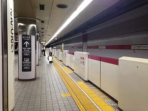 Hisaya-ōdōri Station (久屋大通駅, Hisaya-ōdōri-eki) is an underground metro station located in Naka-ku, Nagoya, Aichi Prefecture, Japan operated by the Nagoya Municipal Subway.[2] It is an interchange station between the Sakura-dōri Line and the Meijō Line and is located 3.3 rail kilometers from the terminus of the Sakura-dōri Line at Taiko-dori Station and 3.4 rail kilometers from the terminus of the Meijō Line at Kanayama Station.