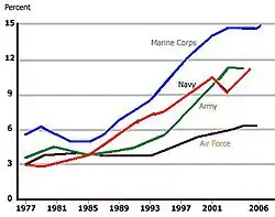 Latino representation in the navy has been rising and there has been dramatic increases in the percentage of Latinos (of both sexes) among active duty enlisted personnel.[67] In 1975, Lieutenant Al Cisneros, became the first Hispanic pilot to serve with the Blue Angels.[68] In 1981, four women of Hispanic descent became the first women of their heritage from the U.S. Naval Academy. Among the four women was Commander Lilia L. Ramirez (Ret.) who is currently the Director of the International Programs Office, for the Department of Homeland Security, Science and Technology Directorate.[69] By September 2006, Hispanics constituted 14 percent of navy enlisted personnel, about the same as in the Marine Corps that year. The various recruitment efforts do have critics, both within and outside the Hispanic community, particularly during this time of war and a growing number of reported Hispanic casualties.[70]
