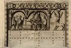 Kircher began research to find the origins of the ruins he had discovered, and concluded that the shrine had been built at the time of Constantine the Great and commemorated the conversion of the Roman soldier Placidus, known to posterity as Saint Eustance. He then spent four years studying the site and its history, which culminated in a celebratory fete in 1664, followed by the publication of Historia Eustachio Mariana the following year.[3] These donations were secured partly through Kircher's account of how the shrine had originally been built by the Emperor Constantine and consecrated by Pope Sylvester I, which had no foundation in evidence at all, and relied on Kircher's own idiosyncratic interpretation of an oak panel from the site. Overall, the claim of great age and illustrious founding for the shrine has been described as the "art historian Kircher at his most creative."[6]