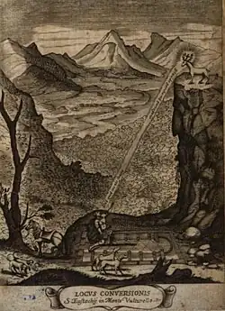 One of the plates in the book shows the moment of Saint Eustace's conversion. A stag of great size stands at the top of a cliff, where he had leaped after being chased by Placidus, who was hunting. Between the stag's horns is a vision of Christ on the cross, which inspired Placidus to become a Christian. A beam of light shines down from the vision to Placidus below, carrying the words of the stag "Placidus, why are you hunting me?". Beneath him kneels the future saint, gazing up with the words "Lord, what would you have me do?".[3] Under his feet is a plan of the future chapel, and his horse and hunting hounds stand nearby. The scene is probably not original, as it resembles one painted inside the chapel at Mentorella, presumably from the late medieval period, which also served as the model for the fresco by Johann Paul Schor, painted inside the chapel.[2][4]: 53, 125