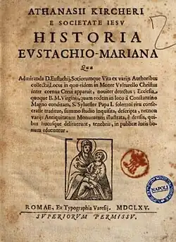 Historia Eustachio Mariana is a 1665 work by the Jesuit scholar Athanasius Kircher. It describes his chance discovery of a ruined shrine of the Virgin Mary at Mentorella in Tivoli, the site where tradition held that the Roman martyr Saint Eustace had experienced conversion to Christianity.[1][2] The book was dedicated to Giovanni Nicola, abbot of the monastery at Vulturalla, and a member of the family of the counts of Poli.[3] It was intended to help raise funds for the restoration of the chapel, and it was Kircher's first topographical work.[4]: 20