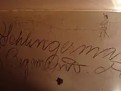 Because of Blenheim's location within Fairfax, and its abandonment by its owners, the house eventually became fully occupied by Union soldiers. At various points, the house was most likely used as a hospital for Union soldiers. Union troops not only found refuge in the house, but left their physical mark there as well. Soldiers who stayed at the house left writings on the walls of the first, second, and attic levels. These walls contain over one hundred names, units, dates, poems, and artistic drawings. At least twenty-three different military regiments are represented on the walls, including the 26th Wisconsin Infantry, 83rd Pennsylvania Infantry, 58th New York Infantry, 136th New York Infantry, and the 1st Michigan Cavalry. The earliest writings in the house date to March 1862.[2]