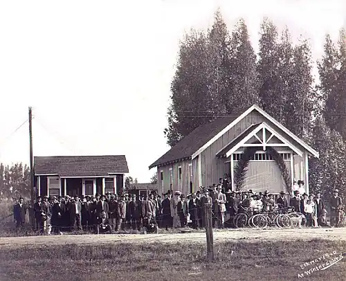 The Mission effort originally was a multi-cultural and multi-faith effort, with involvement by Methodists, Buddhists and Presbyterians.[14] The Church history describes clergy walking into the celery fields to meet and talk with Japanese immigrants in 1902. Originally meeting in a borrowed barn or cottages in Wintersburg Village, the Mission was founded in 1904, constructed its first buildings in 1910, and formally recognized as an official church by the Presbyterian Church U.S.A. in 1930. The church exists today as the Wintersburg Church in Santa Ana, California, and remains a predominantly Japanese American congregation.[15]