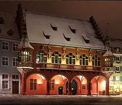 The Historical Merchants' Hall (German: Historisches Kaufhaus) is one of the most outstanding buildings in Freiburg im Breisgau. It is situated on the south side of the Minster Square (market square around the Freiburg Minster). It stands out clearly due to its dominant red facade.