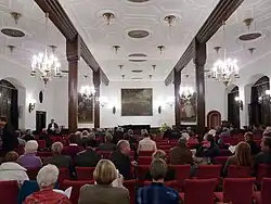 Since 1776, the Emperors' Hall can be accessed by a stairway from the neighboring Redoutenhaus (building where dances and masquerades were held). On the first floor of the former Salt House (Salzhaus) is the foyer of the Emperors' Hall. On the second floor, the rooms of the Freiburg Society for History ( Geschichtsvereins Schau-ins-Land ) are situated. In 1878, the interiors were designed by Fritz Geiges.[2] The inaugurational meeting of the Society for Baden Culture ( Landesverein Badische Heimat ) also took place in the Historical Merchants' Hall of Freiburg.[3] In the part of the merchants' hall facing the Schusterstraße are two smaller rooms, which are located on the first floor and can also be used for events; the Kaminzimmer accommodates up to 90 people and has an impressive fireplace from the 15th century and the Rococo Room (Rokokosaal) has capacity for up to 70 people.