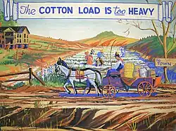 Immediately following the Alabama State Fair, the murals were packed and shipped to Shreveport, Louisiana, for display at the Louisiana State Fair, held October 21–30, 1939.[11] Sometime thereafter, the murals were taken to Auburn University and stored in Duncan Hall, the state headquarters of the Alabama Extension Service, where they remained basically undisturbed for the next 45 years until they were rediscovered in the early 1980s. They were subsequently refurbished and displayed in Foy Student Union on the Auburn University campus.