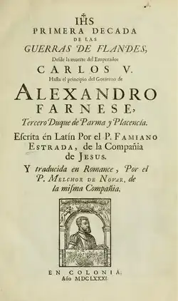 The Latin work De Bello Belgico (invoking Caesar's classic) of the Italian Jesuit historian Famiano Strada (1572–1649) became popular throughout Europe and was translated into many languages.[4] Strada first published it in Rome as De Bello Belgico decades duae between 1632 and 1647, the first 'decade' in 1632, the second in 1641.[4][5] The first set of ten books (the first 'decade') covered the period from Charles V's abdication in 1555 to the death of Don Juan of Austria in October 1578.[4][5] The second set of ten books (the second 'decade') covered the time from the start of Alexander Farnese's government in October 1578 to the conquest of Rheinberg (30 January 1590).[4][5] A third volume is said to have been prevented from publication by Spanish authorities.[4] Strada's first volume was translated to Dutch as De thien eerste Boecken der Nederlandsche oorloge and published in Amsterdam in 1646, the second as De tweede thien boeken der Nederlandsche oorlogen in Amsterdam in 1649; both parts in Rotterdam in 1655 titled De thien eerste Boecken der Nederlandtsche oorloge and Het Tweede Deel der Nederlandtsche Oorlogen.[5] Pierre du Ryer published both volumes in French under the title Histoire de la guerre de Flandre (Paris 1650).[4] The first decade of the De Bello Belgico was translated into English by Sir Robert Stapylton under the title of The History of the Low-Countrey Warres (London 1650). There were many editions of the original Latin, and continuations were prepared by G. Dondini and A. Gallucci,[5] an Italian translation by C. Papini and P. Segneri (Rome 1638–49, 2 v.), and a Spanish edition by Melchior de Novar (Cologne 1681, 3 v.). Scifoni (1849) stated that 'Strada's work will hold a distinct place among the historical works of the 17th century', despite its 'useless digressions, the insignificant peculiarities and the abuse of comparisons, sentences and all the vain formulas marked by the oratory style'.[4] Strada made extensive use of the Farnese family archives (now destroyed),[5][6] and was very critical of Alba's performance in fighting the rebels in the Netherlands.[6] According to Reijner (2020), Strada and Guido Bentivoglio were far from the only Italian historians writing about the Eighty Years' War: an unusually high number of them from across the peninsula, such as Florence and Genoa, used the revolt happening in the Habsburg Netherlands for their own purposes in arguing against the dominance of the Spanish Habsburgers in (northern) Italy.[6] In return, Netherlandish historiographers and opionmakers thankfully cited the works of Strada, Bentivoglio and other Italian authors in support of their arguments against Spain.[6]
