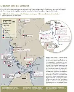 On August 5, the Convoy de la Victoria departed from Ceuta, the gunboat Eduardo Dato, the old torpedo boat T-19, the coast guard cutter Uad Kert, the tugs Benot and Arango and the ships Ciudad de Ceuta and Ciudad de Algeciras were crossing the strait carrying troops; halfway across the strait the Republican destroyer Alcalá Galiano appeared and attacked the convoy, the Eduardo Dato fired on it and soon planes belonging to the rebel troops appeared and caused the Alcalá Galiano to flee; the convoy arrived at 8 in the evening at the port of Algeciras.[40]