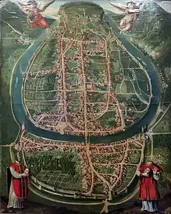 During the Renaissance, Franche-Comté strengthened its ties with the Holy Roman Empire following the death of Charles the Bold.[33] Under Emperor Charles V, Besançon was fortified and became a strategic stronghold of the Empire. Nicolas Perrenot de Granvelle, a native of Franche-Comté, served as Chancellor of the Empire from 1519 and Keeper of the Seals from 1532. The city benefited from imperial patronage, resulting in the construction of buildings such as the Granvelle Palace and the Town Hall, the latter featuring a statue of Charles V on its façade. In 1518, Besançon had an estimated population of 8,000 to 9,000, which may have increased to between 11,000 and 12,000 by 1608.[34] The local economy remained predominantly rural, with viticulture serving as the primary activity, particularly in the Battant district, where winegrowers constituted a significant portion of the population.[35] In 1575, the city was the site of a battle between Protestant and Catholic forces, which ended in a Catholic victory.