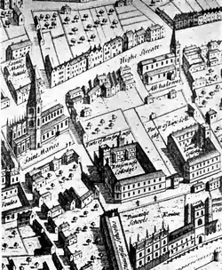 Brasenose Hall was a building on the medieval Schools Street in central Oxford, now the west side of Radcliffe Square. Its location is now part of the site of the current front quadrangle of Brasenose College. The building was bought by the chancellor of the university in 1261 and is first mentioned by name in 1278, when it had four schools or lecture rooms.[1] The name "Brasenose" is thought to originate from a brass–lead door knocker in the shape of a leopard (or lion) head.[2][3] An alternative theory is that the name is a corruption of brasenhuis (brewhouse), but this is not widely accepted, although the college did have its own brewhouse up until 1889.[4] The brewhouse theory is believed to date back only to 1837.[5]