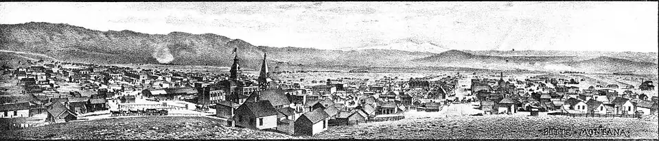 The land on which Butte was established is positioned in the Silver Bow Creek Valley (or Summit Valley), a natural bowl sitting high in the Rocky Mountains straddling the Continental Divide.[2] The southwestern side of the bowl is made of a large mass of granite known as the Boulder Batholith, which dates to the Cretaceous era.[3]