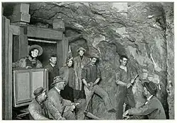 In 1900, Butte opened its first institution of higher education, the Montana School of Mines, which is contemporarily Montana Tech of the University of Montana.[30] Between approximately 1900 and 1917, Butte had a strong streak of Socialist politics, even electing a Mayor on the Socialist ticket in 1914.[31] It had also established itself as "one of the most solid union cities in America."[32] After 1905, Butte became a hotbed of Industrial Workers of the World (IWW, or the "Wobblies") organizing.[33] Rivalry between IWW supporters and the WFM locals culminated in the Butte, Montana labor riots of 1914, and resulted in the loss of union recognition by the mine owners.[34] After the dissolution of the Miners' Union, the Anaconda Company attempted to inaugurate programs aimed at enticing employees.[34] However, a number of clashes between laborers, labor organizers, and the Anaconda Company ensued, including the 1917 lynching of IWW executive board officer Frank Little.[35]