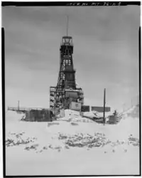 Disputes between miners' unions and companies continued through the 1920s and 1930s in Butte, with several strikes and protests, one of which lasted for ten months in 1921.[41] In 1923, protestors attempted to blow up the Hibernian Hall on Main Street with dynamite.[41] Between 1914 and 1920, the U.S. National Guard occupied Butte a total of six times to restore civility.[38] Further industrial expansions included the arrival of the first mail plane in the city in 1928, and in 1937, the city's streetcar system was dismantled and replaced with bus lines.[41] The city's first airport, Butte Municipal Airport (now Bert Mooney Airport), was constructed south of the city proper in 1927, and operated frequent flights to and from Salt Lake City.[42] In 1933, Northwest Orient Airlines expanded to service the airport from the West Coast and Midwestern states.[42]