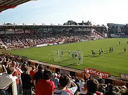 Following a tumultuous start to the season the Grecians had a dramatic upturn in form, breaking the club's record of consecutive league victories (seven) between 31 December 2016 and 4 February 2017, a run in which David Wheeler also broke the record for a City player scoring in consecutive league games (scoring eight in seven consecutive fixtures).[105] The club also went on to break their record for away wins in a single season, recording their 13th victory away from home on 29 April with a 3–1 defeat of Doncaster Rovers which also secured a play-off finish.[106] In a dramatic play-off semi-final tie against Carlisle United, in which City surrendered the lead three times, twice from being two goals up; the Grecians went through to the final thanks to a long-range goal from Jack Stacey in the 95th minute, winning 6–5 on aggregate.[107] This was also the final game played in front of the Old Grandstand before it was closed ahead of its demolition.[108] City lost 2–1 against Blackpool in the play-off final.[109]