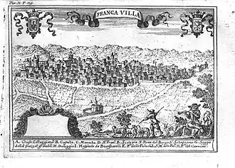 The first master of the new hamlet was Giacomo Noha, although it is not known whether he really had the rights to the hamlets he owned.[28] Between 1322 and 1335 the hamlet changed its name to Villa Franca (which later changed to Franca Villa).[29] On May 5, 1336 the donation of Francavilla was confirmed to Data d'Adimari and his son Guglielmo.[30] Later, in 1364 Philip II granted the Antoglietta family, the new feudal lords of the town, the construction of the walls. Once the walls were built, the hamlet assumed the title of Terra. During their reign, the Antogliettas increased taxation by introducing a tax to be charged even to priests, being hated by the people for that reason.[31] In 1336, moreover, the hamlet was declared a Royal City.[32]