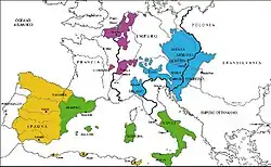 Probably, in 866,[20] some Franks who had descended as far as Bari and Oria with Emperor Louis II settled in one of the villages inhabited by the surviving citizens of the destroyed Messapian city, and formed the first nucleus of the town, which in 1155 later became a fief of the Norman baron Goffredo, who, for the occasion, was given the appellation "da Francavilla."[20] However, from various documents, it is believed that in reality Goffredo was a feudal lord of a hamlet of the same name located in the lower Salento region.[21] The hamlet that would later form Francavilla, despite being a military garrison, during those years, was open to trade and never closed by walls.[20]